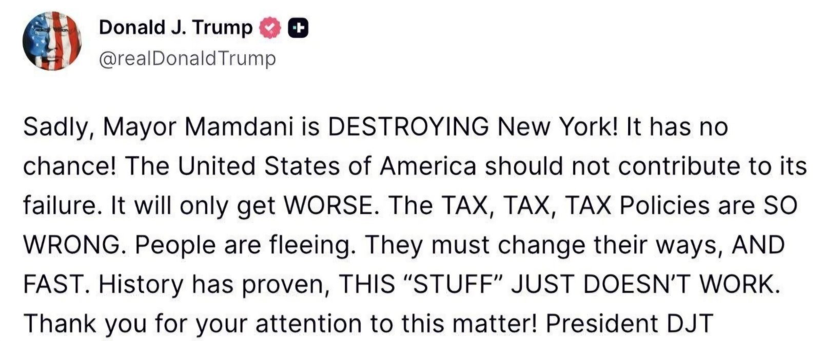 Трамп: К сожалению, мэр Мамдани РАЗРУШАЕТ Нью-Йорк! У него нет шансов! Соединённые Штаты Америки не должны способствовать его провалу. Всё будет ТОЛЬКО ХУДЕТЬ. Политика НАЛОГОВ, НАЛОГОВ, НАЛОГОВ ТАК НЕПРАВИЛЬНА. Люди уезжают. Они должны изменить свой подход, И БЫСТРО. История доказала, что ЭТОТ "ХЛАМ" ПРОСТО НЕ РАБОТАЕТ. ################## Худеть? 😁 Ага,без буквы "д". Беднеть, или хуже ( worse) имелось в виду, наверное. Ну Ньюйоркцы сами его выбрали, пусть страдают...в следующий раз будут лучше думать ... После всех перемирии- Трампа надоело слушать.... Через неделю скажет, что он хороший парень и лучший из мэров.