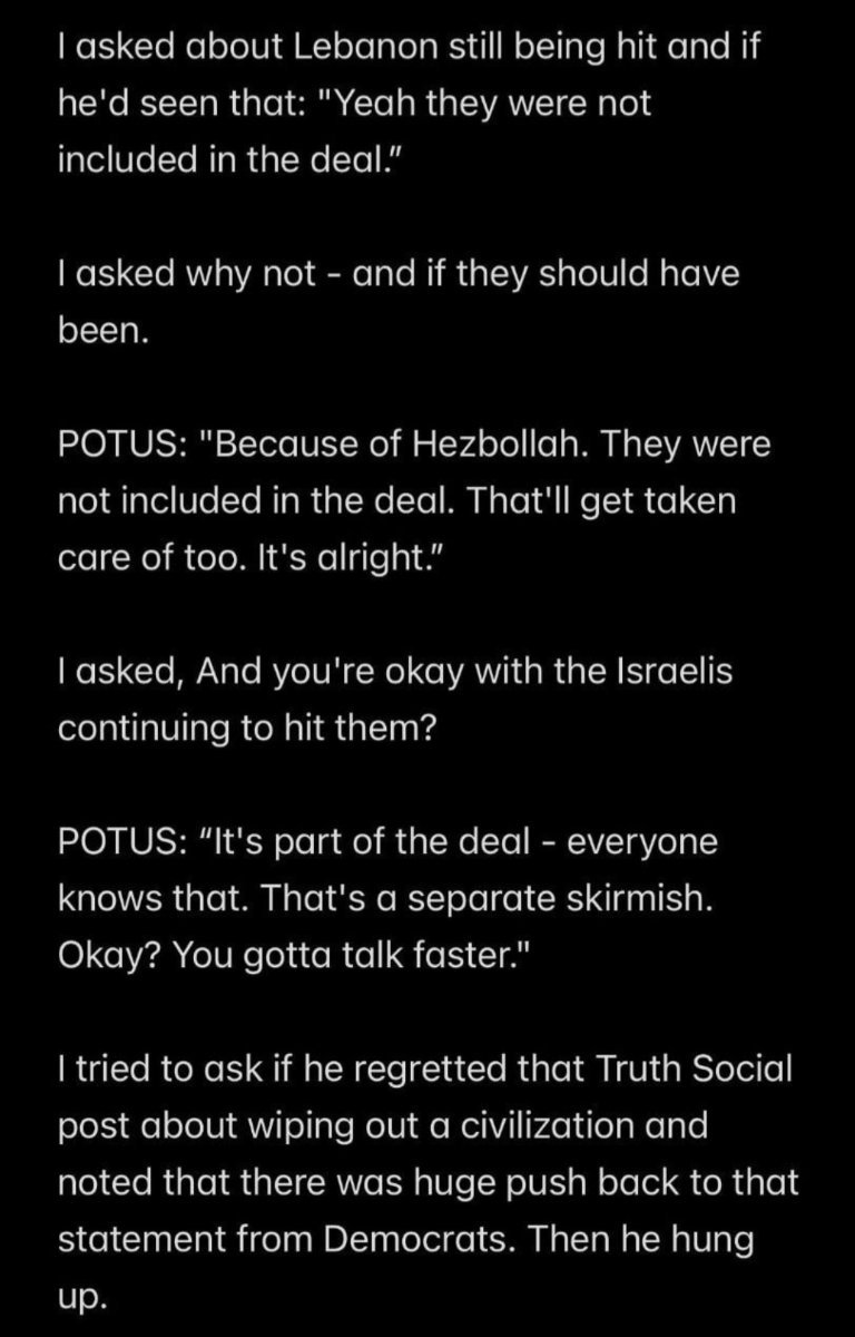РАЗ Высокопоставленный иранский чиновник службы безопасности для Press TV: Весь мир находится на грани нарушения хрупкого и временного перемирия со стороны сионистского режима, и Иран может в любой момент перейти к всеобъемлющей защите. Нарушение перемирия с одновременной атакой на Ливан и Иран повышает цену соглашения для США, и теперь посредническое государство должно вмешаться и сдержать «агрессивный режим». Он также добавил, что если перемирие рухнет, ответственность ляжет на Израиль, и Иран «накажет нападающих», а стабильность, возникшая после открытия Ормузского пролива, быстро закончится. ДВА Президент Трамп: «Ливан не является частью соглашения» — так он сказал журналистке Лиз Лендрес, корреспондент PBS в Белом доме, поговорила с президентом Трампом по поводу Ливана. Вот что она опубликовала: Я спросила о Ливане, который все еще подвергается нападениям, и видел ли он это. Трамп ответил: «Да, они (Ливан — прим. ред.) не включены в сделку.» Я спросила: почему нет — и должны ли они были быть включены. Трамп ответил: «Из-за Хезболлы. Они не включены в сделку. Это тоже будет решено. Всё в порядке.» Я спросила: и вы не против, что израильтяне продолжат наносить им удары? Трамп ответил: «Это часть сделки — все это знают. Это отдельный конфликт. Хорошо? Тебе нужно говорить быстрее.» ################# Короче, в Иране истерика до небес - не высказалась лишь кошка Хаменаи и то, потому что ее у него нет