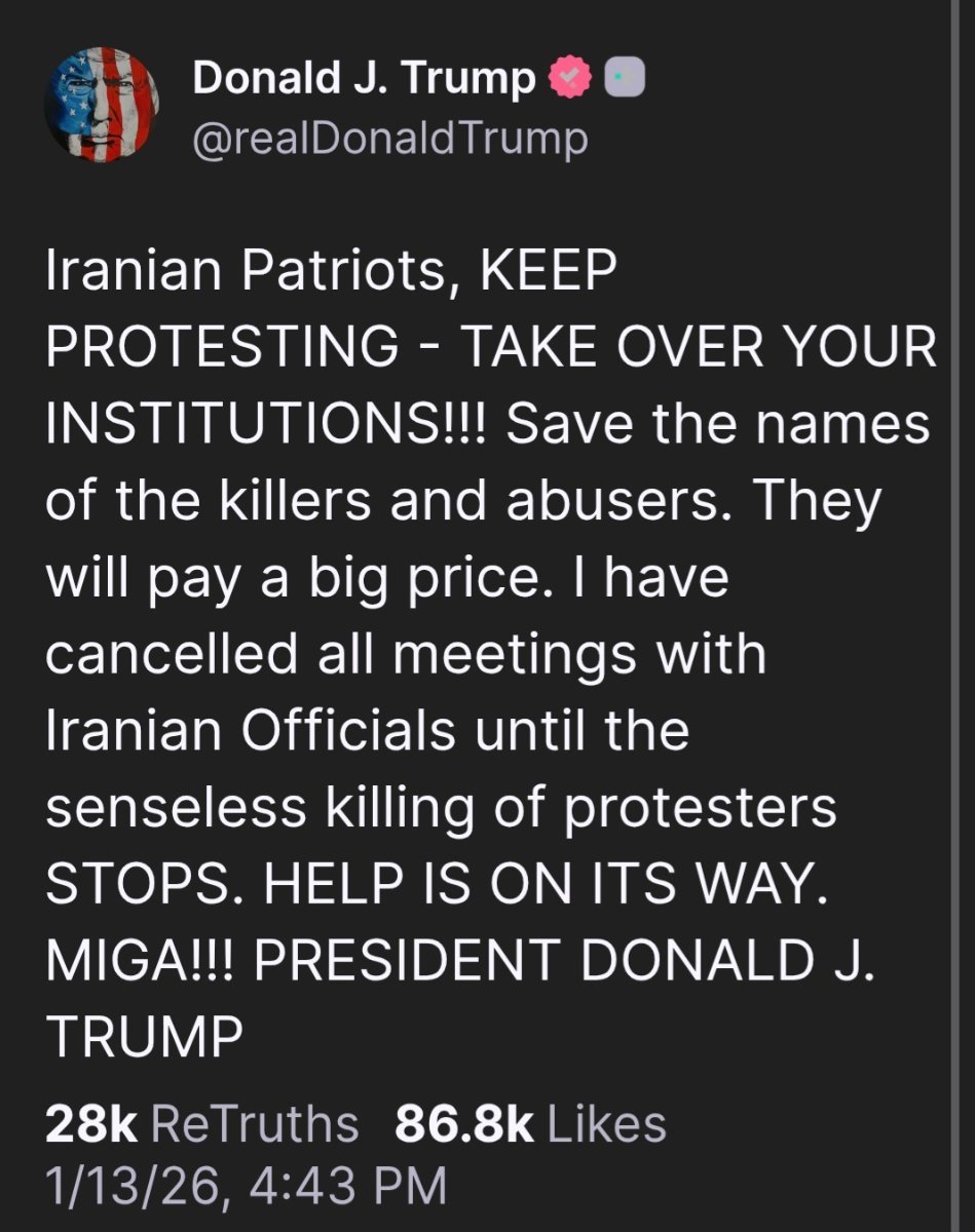 При чём тут моё мнение? Мнеия не вопрос, ложь и деза - да. На тот момент, когда Трамп сказал, что некая помошь в пути, уже было между 500-1000 погибших, так что заявлять о том, что вина за эти жизни на Трампе, это откровенная глупость и ложь. Точно то же самое и по поводу того, что некая бездеятельность Трампа позволила режиму убить народ - бредятима и ложь, я уже писал, и при чём довольно разврнуто, что у Трампа нет никаких рычагов для воздействия на режим Ирана в такой степени, только полная война. Вот что Трамп достиг, так это то, что его угрозы заставили режим очень сильно смягчить действия. Иначе трупов было бы на много больше. Так что не надо тыкать в меня пальцем, надо факты изучать и сопоставлять их с временной линией, что, когда, после чего, и так далее.