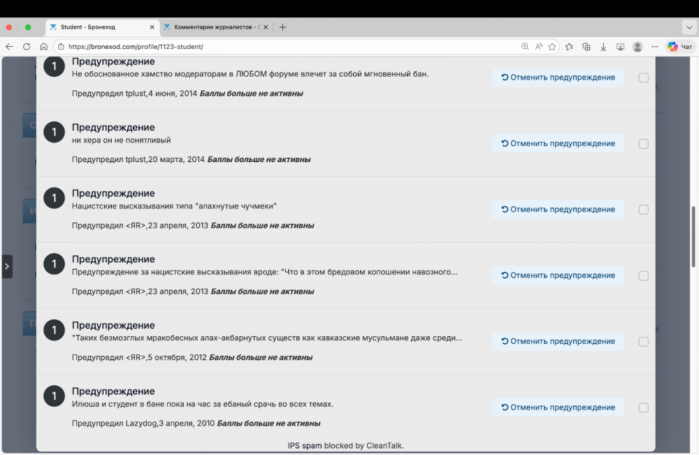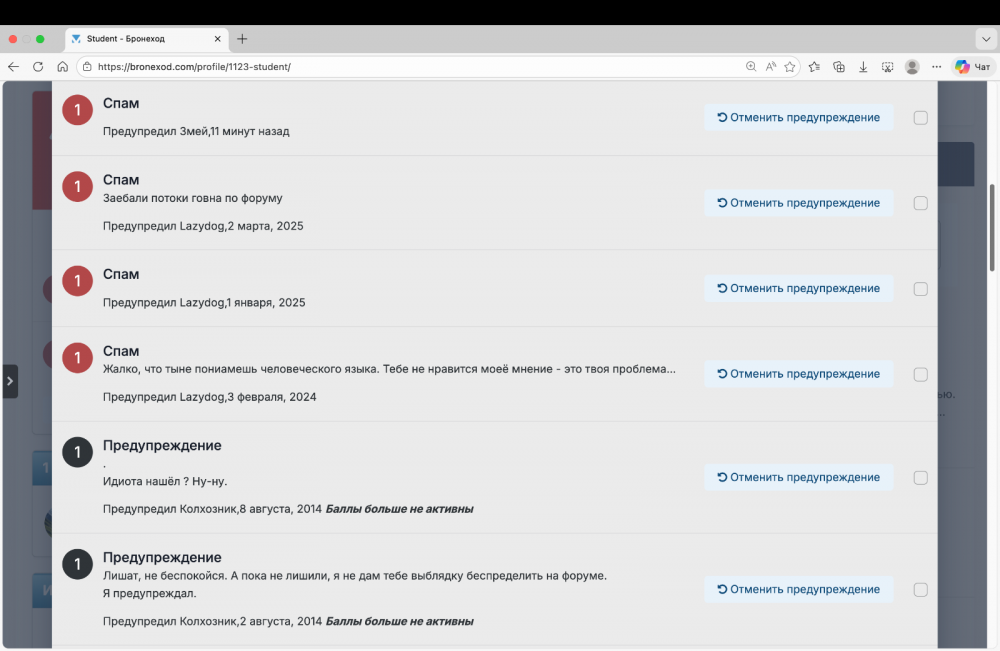 Что бы не было лишнего пиздежа : Студент НЕ заБАНнен! Никто не лишал его права писать на форуме. Просто приняты минимальные меры хоть как то дать ему понять что ХВАТИТ! Информация историческая к размышлению для всех юзеров Бронехода Тема : что и почему. Жизнь Студента на Броне и как к нему всегда относились модераторы и даже хозяин портала. Мыжики! Всё почеснаку. Всё в открытую. Объяснения модераторов за санкции с 2010 года: Хамство, потоки говна, не понимание человеческого языка, выблядок беспределит на форуме, хамство на любом форуме мгновенно ведет за собой бан, нацистские выссказывания и т.д. Терпение закончилось.